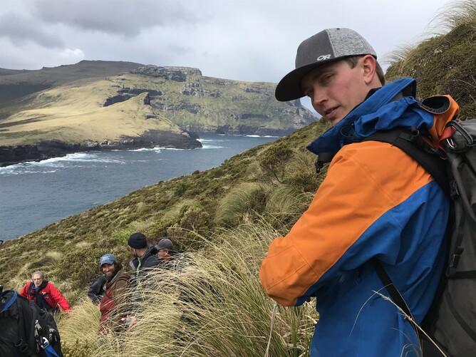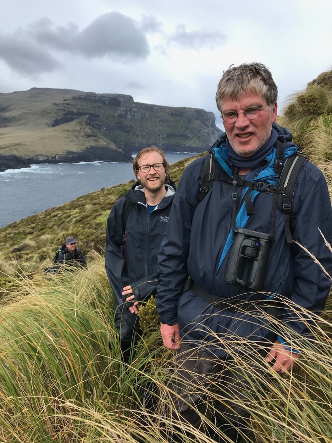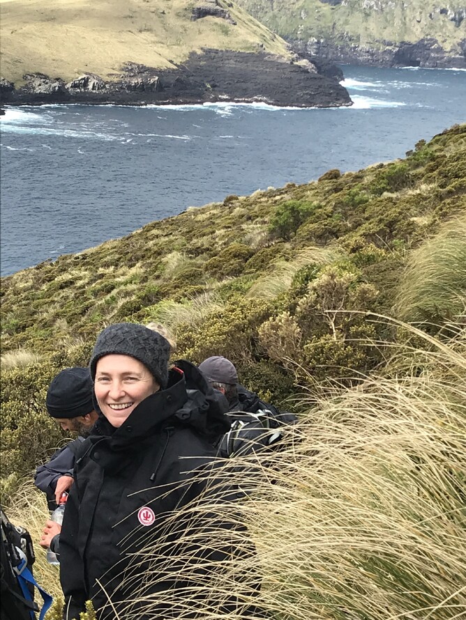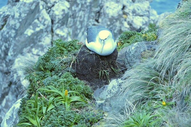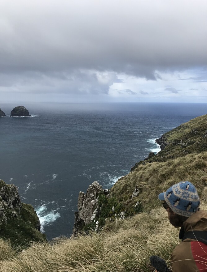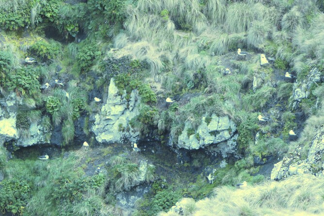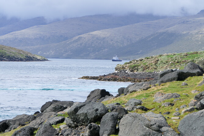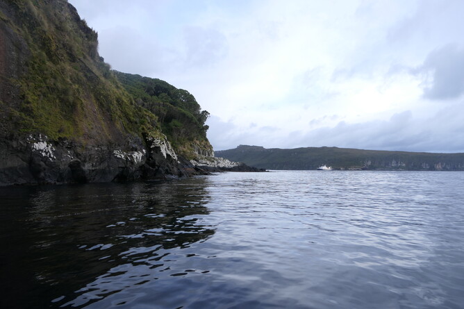 In the southern archipelago of Auckland Island there is a very large sheltered harbour called Carnley Harbour. It is rich in human history including shipwrecks, treasure hunters, coast watchers, and of course scientific parties. We arrive early morning through the eastern entrance. it is guarded on both sides by dramatic cliffs and rugged, tussock-covered hills.