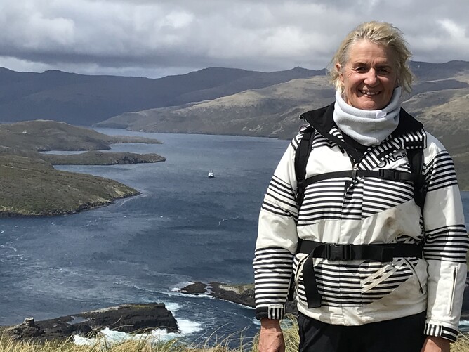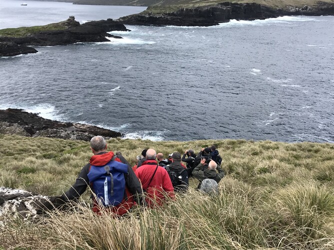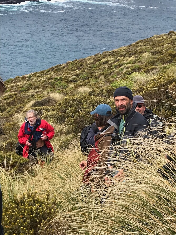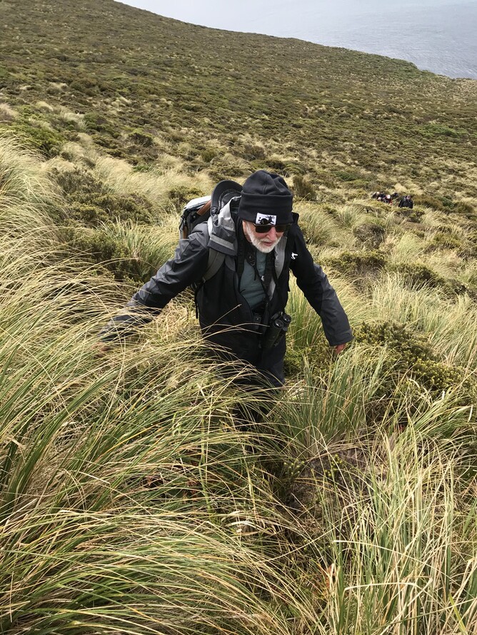 Today we can either climb to the South West Cape and visit the mollymawk colony, or zodiac cruise along the coast of Adams Island and through the western harbour. The climb provides magnificent views in all directions over Carnley Harbour. Bill has a wonky knee and says he will zodiac. I am only here once I think, and I have form and my knees work so we go in different directions. This is the hill we will climb.