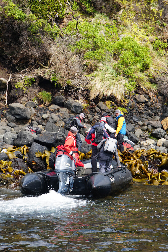 We land (it is rough) and we wait for everyone on grass above the beach to get away from a few sea lions.