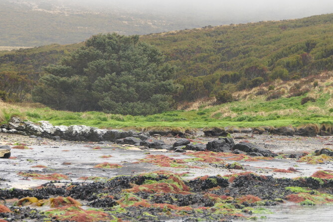We are at Tuckers Cove. Here we see the "world's loneliest tree". It is a sitka spruce planted early this century by a hopeful Earl of Ranfurly, a former Governor General. It’s no great success as a tree and after all these years is only 7.5m high. If it were back in its north west American home it would stand 60m at least. But it has gained distinction in the Guinness Book of Records as the “loneliest tree on earth.”