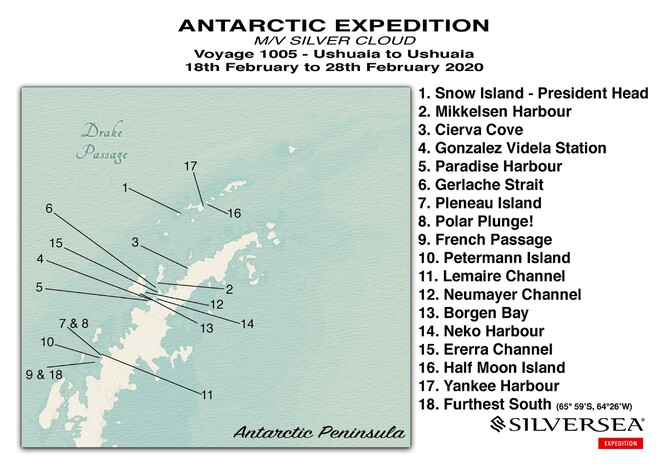 This is our voyage below. (We got this at the end of the trip.) It gives you where we went and where we will go. We land at President Head, Snow Island first. We are on an expedition, which means things change. This first landing was not on the plan, but a good Drake Passage crossing made it doable.