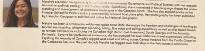 We learnt she is a pilot, a photographer and a poet, as well as a wilderness guide! I asked what would be her dream job? She replied immediately - it would be working as a pilot with rescue missions from a Canadian rescue operation called Borek Air http://www.borekair.com/about-us.html. They do polar flights and have a reputation for taking on missions that other airlines will not do - amazing - and brave.