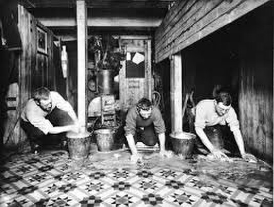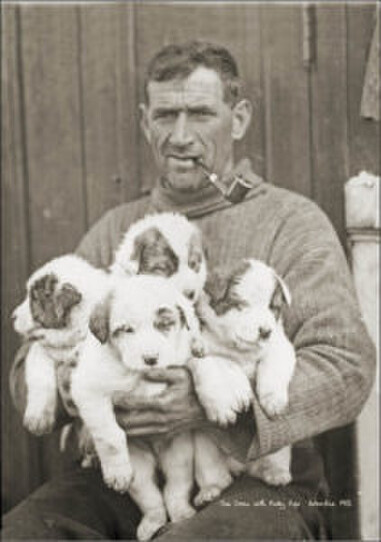 The second story was after the ship became trapped in pack ice and was destroyed, Shackleton decided that Mrs Chippy, and five of the sled dogs that had been carried on board, would not survive. In a diary entry dated 29 October 1915 he recorded: "This afternoon Sallie's three youngest pups, Sue's Sirius, and Mrs. Chippy, the carpenter's cat, have to be shot. We could not undertake the maintenance of weaklings under the new conditions. Macklin, Crean, and the carpenter seemed to feel the loss of their friends rather badly." This is Crean with puppies he had loved.