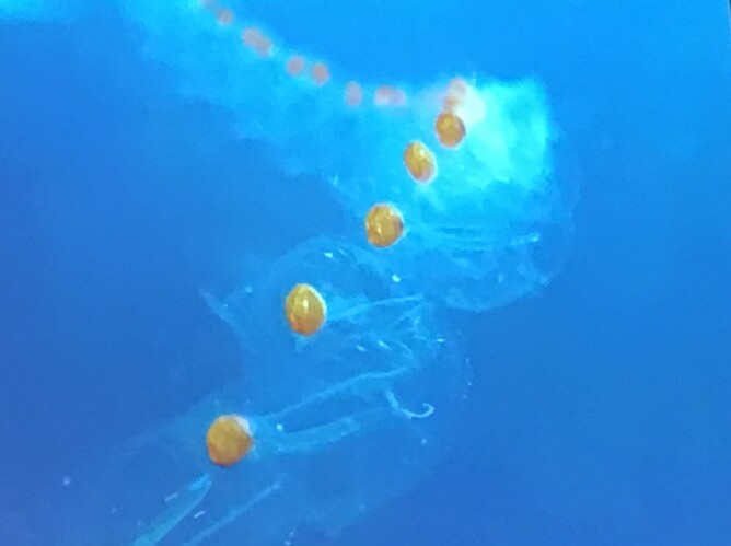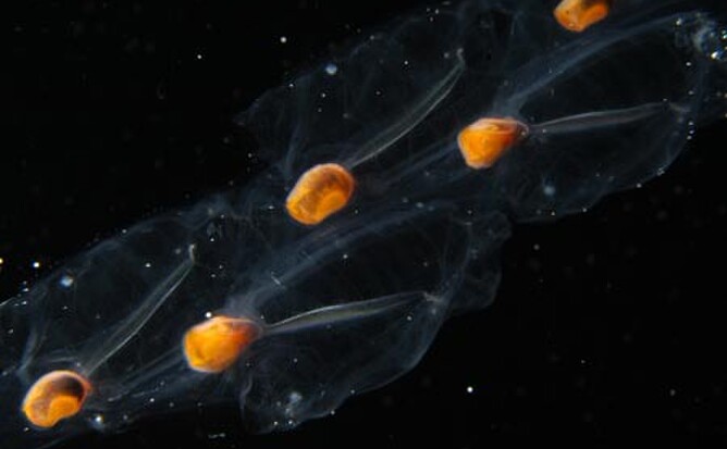More about them from the internet: "The chain of salps, called the “aggregate” stage, after it leaves the parent. The photo shows how they are attached, one to the other. The rows of orange-brown spots are the stomach of the salps."