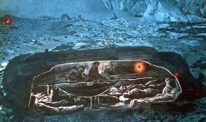 Six weeks after leaving their South Georgia Island south seas base, the Endurance got stuck in the ice. Shackleton realized that his men would have to wait out the coming winter in the ship’s cramped quarters until summer’s thaw. Below is the crew clearing the ice away from the ship.