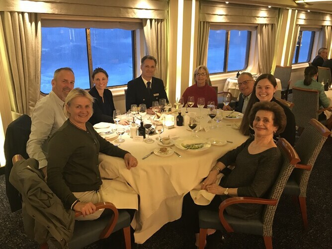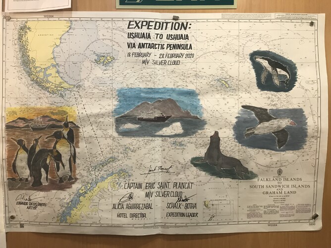 While we were enjoying the dinner and each other's company, the ship rocked more and more and plates starting sliding off the table. Eric said he had chosen this side of the restaurant because the other side was getting hit harder by the waves! He left the table to make an announcement to everyone. I cannot remember exactly what he said, but his voice was calm and soothing and something like "We are in the Drake Passage, we knew we would get the turbulence. There is nothing to worry about. Our forecast for today was 3-4 metre swells, tomorrow is 6+ metres so better to be going fast today. The ship can withstand this. Hold on and enjoy your last night on the ship."