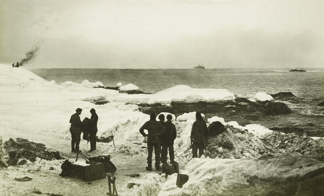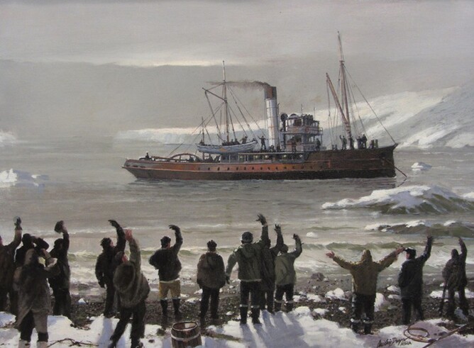 Three months later they rescue the men left on Elephant Island with a Chilean Admiralty tugboat and a British whaling boat. This photo is Shackleton's men on Elephant Island seeing their rescuers coming - they have a smoke beacon going letting them know where to come to.