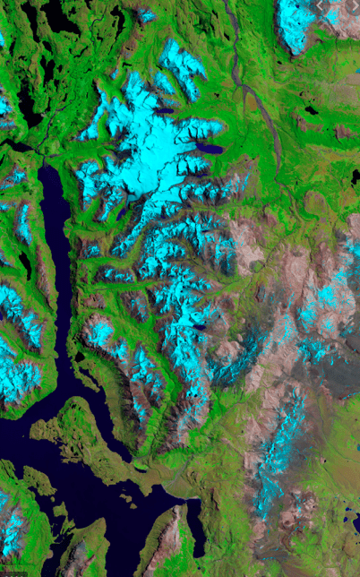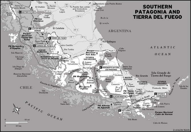 This is what Tierra del Fuego looks like. The indigenous population and thousands of guanaco, a small deer-like animal, roamed the 17,000 square mile island. It's climate was described by an early settler as "65 unpleasant days per year along with 300 days of rain and storms". Blue is ice, green forest, and dark blue the Beagle Channel.