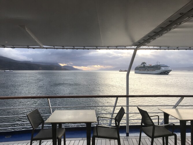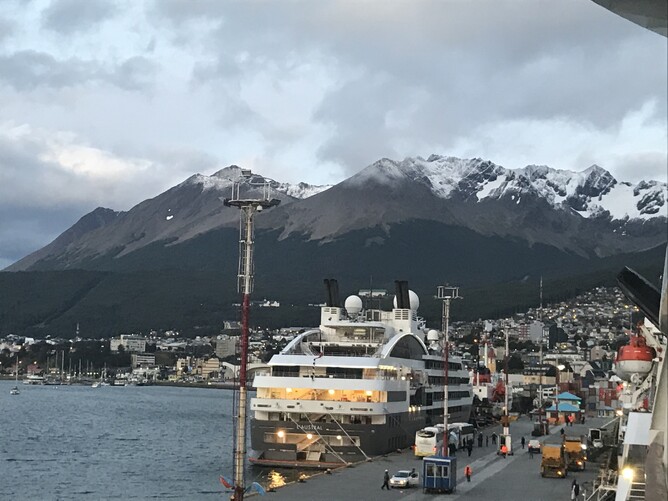 We arrive in Ushuaia at 6.50am. The view at breakfast (after we have cycled). There are other boats getting in ahead of the Drake Passage weather too.
