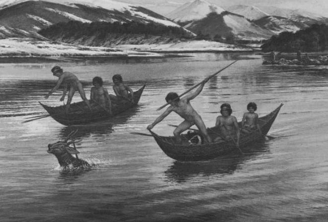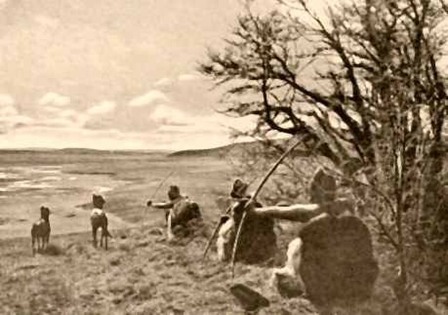 They fed on guanco (natural deer who roamed the lands), ground rats, birds, stranded whales, fish, mussels, berries and mushrooms. Here they are hunting.