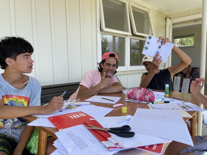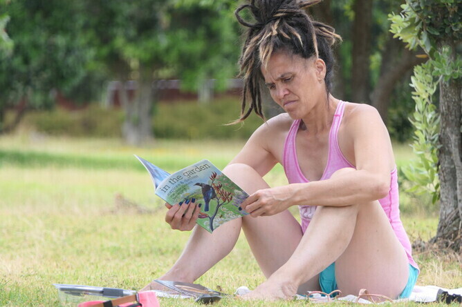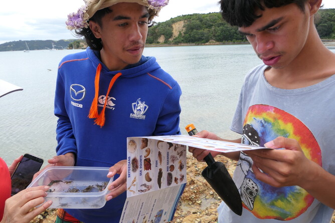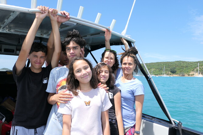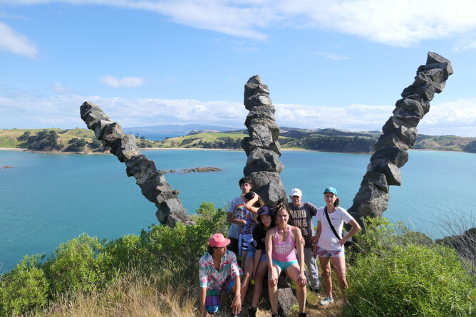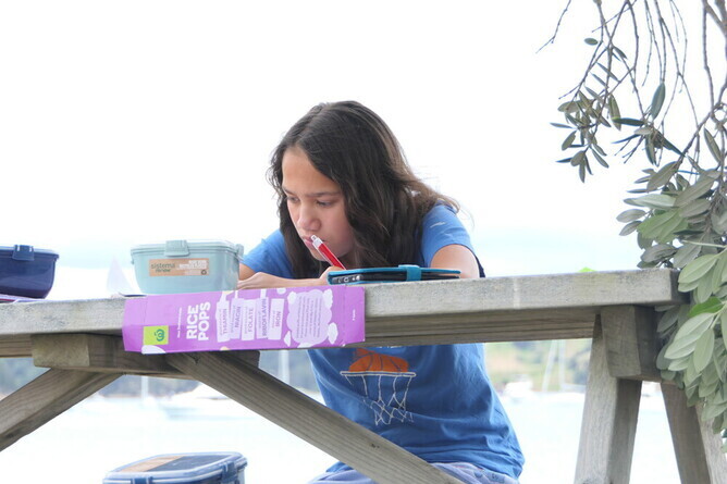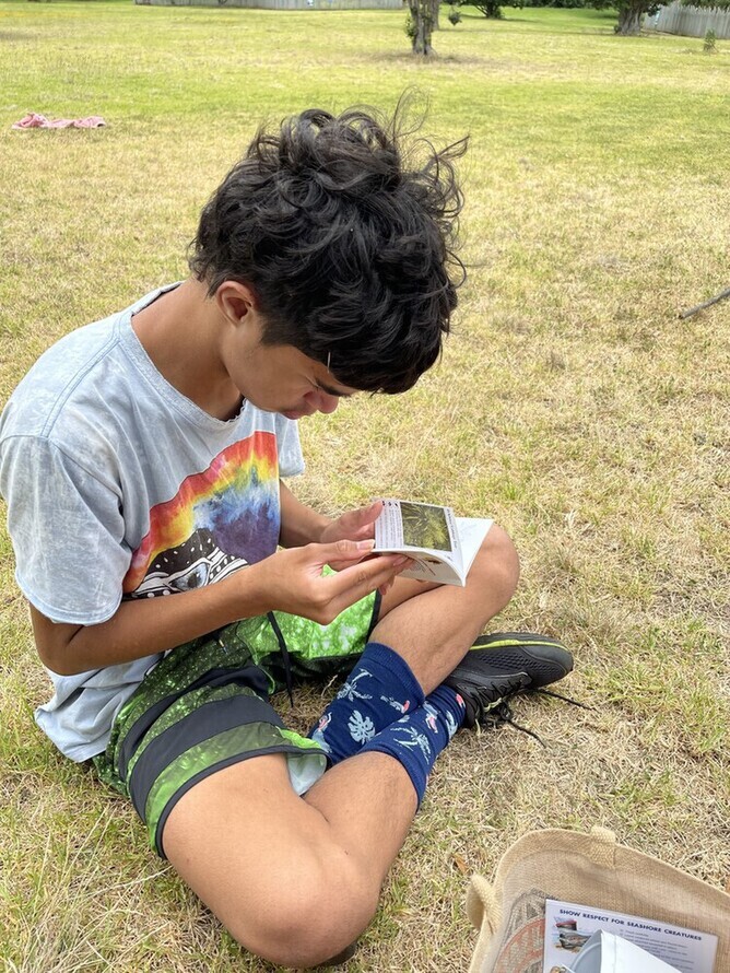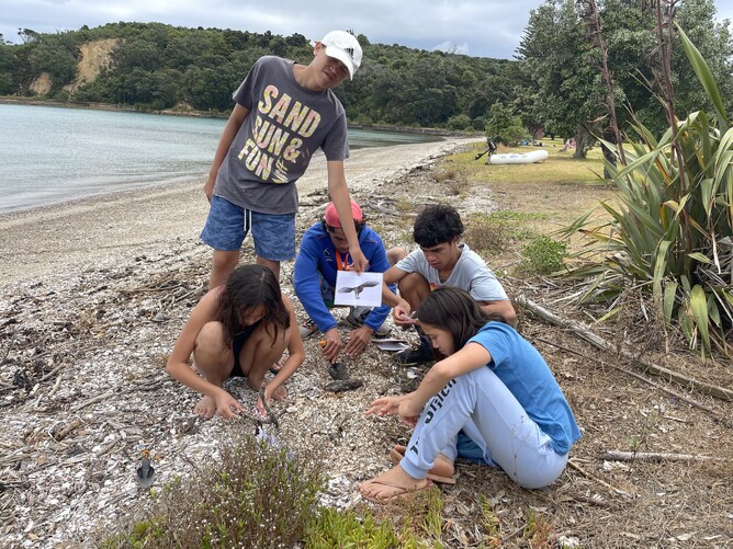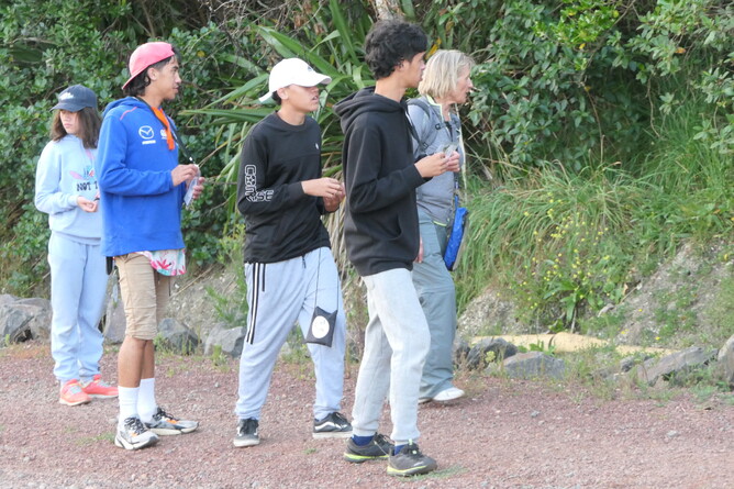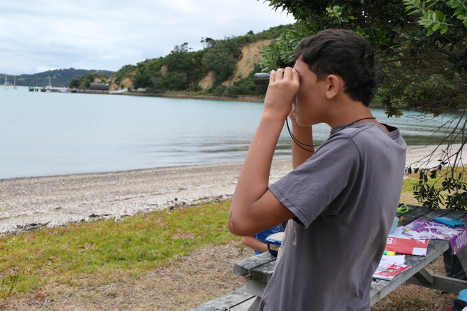 We all got up for breakfast. We had bananas, blueberries, yoghurt, milk and always cleaned up after ourselves. Mums and Robin made wraps for lunch. We headed for some activities in Home Bay. Tama and I did an activity called 'Backyard Detective'. Albert read bird and plant books by Andrew Crowe. Makayla and Mikaya did some work on their nature journals. Trish/Mum also became an Aranga Kaitaki ranger and read.