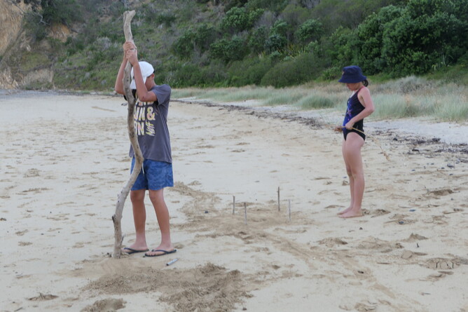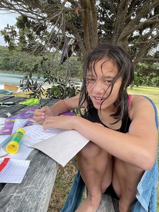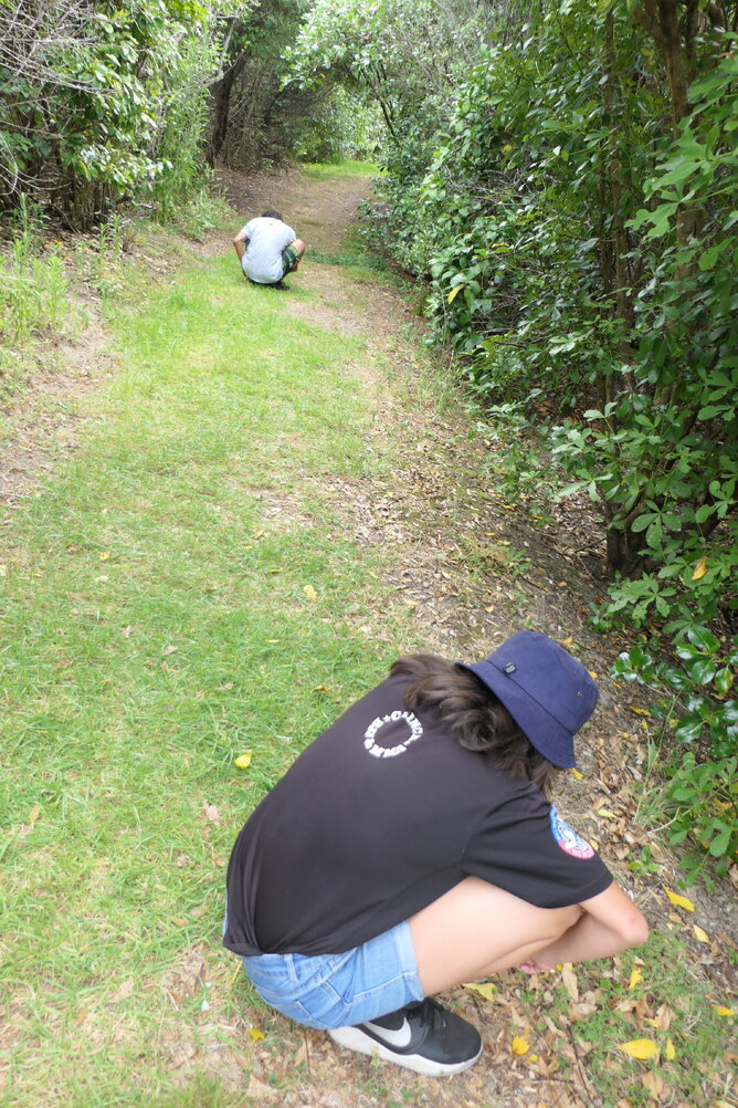 We headed back home a bit faster on the same track. We were all looking forward to going for a swim. We did wait for 10 minutes just before Mens Bay to listen to nature noises. We also had five plants to find. We found Harakeke, Manuka and kana. We couldn’t find kowhai or mahoe. We ask Milly when we buy some icecreams off her. She says there is a kowhai in the front of our restful home. We could collect the leaves and put in our journal pockets. We had better ask whether we can.