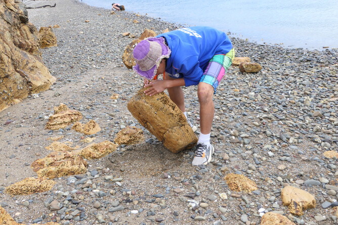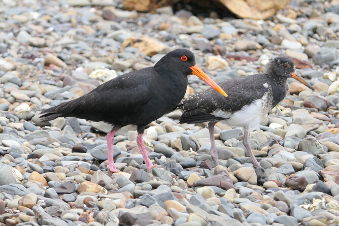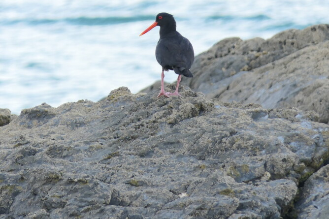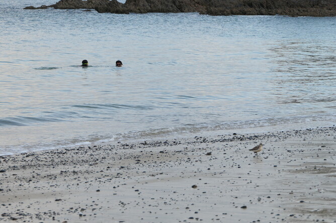 We took our packed lunch again to Ladies Bay . Oh no!!, when we arrived there were so many people at our beach?! Three big boats and about 40 people. Today we will have to share. Albert and Robin went around the point. Robin says Albert is like a penguin the way he hops from rock to rock. She says maybe he has super power penguin abilities, because he can jump so high. They saw a 'boil up ' at sea and more dotterels and tōrea. Can you spot the dotterel?