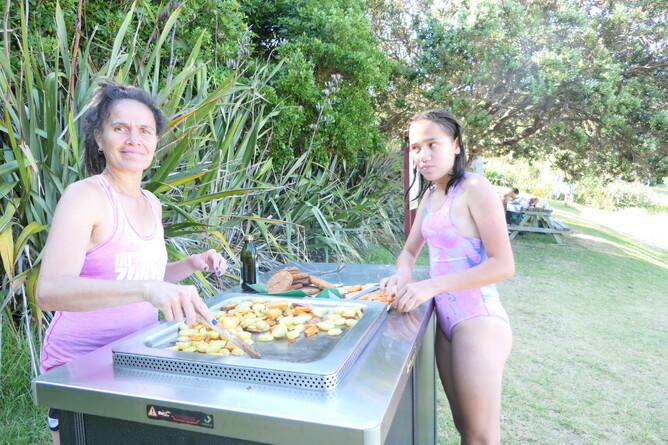 After getting things sorted with our rooms and luggage, we set off to Ladies Bay with our swimming gear and stuff for dinner. We first all took dips in the water. It was so hot. The freshness of the water cooled us all. Makayla and Mikaya seemed to stay in the water for hours. Milly, Glen's wife, was also swimming and we all introduced ourselves. The bro's then went exploring around the bay and the next bay looking for crabs or whatever we could find. The Mums cooked chips and burgers on the bbq. Makayla assisted. The bro's found many crabs and shrimps. We then heard our Mum calling out our names around the coast. It was fuelling our tummies with delicious vegan burgers and chips time.