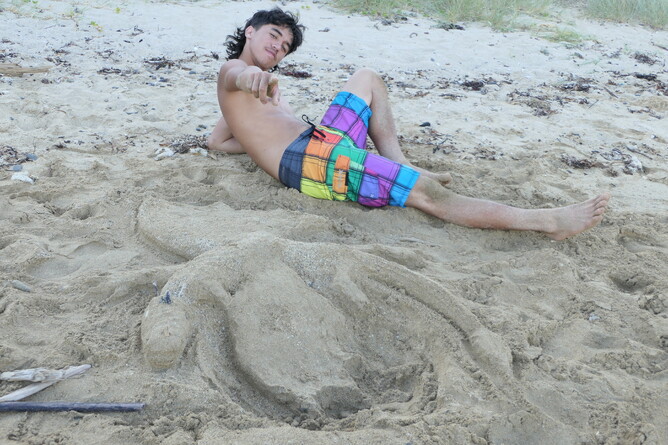 Albert started collecting feathers. I gave him a feather I found and he put that in his journal pocket. He has a weka , a tieke and a Pukeko feather in his pocket I think. The views were spectacular, and there were expensive boats cruising. We picked up our togs from our restful home and headed towards Ladies Bay. Mums made dinner. This time it was hot dogs and chips cooked on the barbecue with some salad. It was delicious. We had the beach to ourselves. I wrote 'Skateboarding' on the beach with a large stick. Someone from the air would see it.