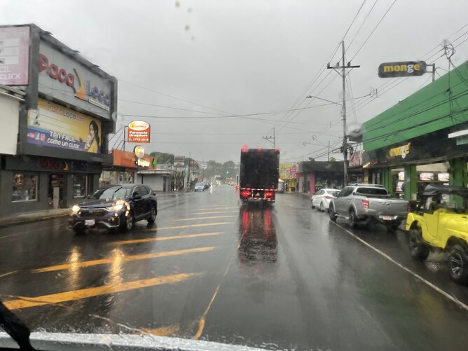 We get to the coast, and towards the end of the trip there is some heavy rain.